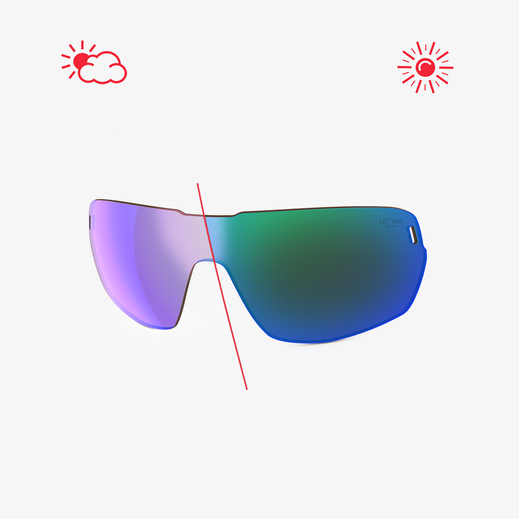 Glasfarbe: Vario - LST Bright Vario Blue Green Mirror - orange Grundfarbe - selbsttönend von orange zu dunkelbraun / speziell für helle Lichtverhältnisse - Photochromic |